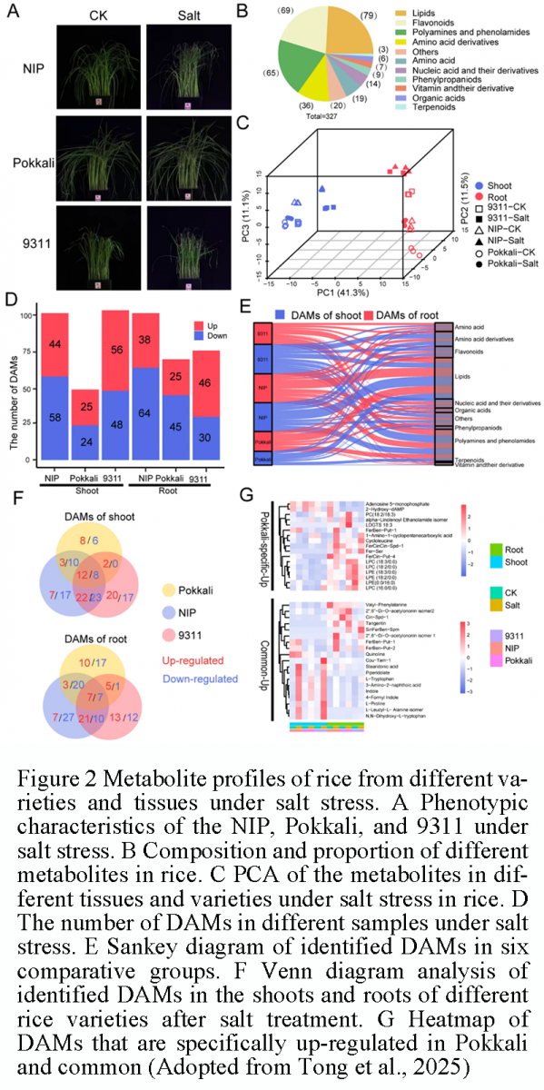 ![]() Figure 2 Metabolite profiles of rice from different varieties and tissues under salt stress. A Phenotypic characteristics of the NIP, Pokkali, and 9311 under salt stress. B Composition and proportion of different metabolites in rice. C PCA of the metabolites in different tissues and varieties under salt stress in rice. D The number of DAMs in different samples under salt stress. E Sankey diagram of identified DAMs in six comparative groups. F Venn diagram analysis of identified DAMs in the shoots and roots of different rice varieties after salt treatment. G Heatmap of DAMs that are specifically up-regulated in Pokkali and common (Adopted from Tong et al., 2025) |