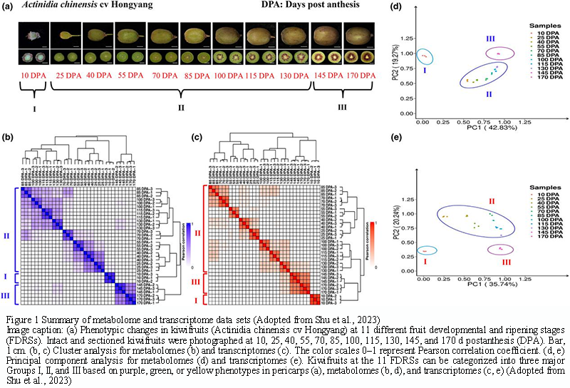 Image caption: (a) Phenotypic changes in kiwifruits (Actinidia chinensis cv Hongyang) at 11 different fruit developmental and ripening stages (FDRSs). Intact and sectioned kiwifruits were photographed at 10, 25, 40, 55, 70, 85, 100, 115, 130, 145, and 170 d postanthesis (DPA). Bar, 1 cm. (b, c) Cluster analysis for metabolomes (b) and transcriptomes (c). The color scales 0-1 represent Pearson correlation coefficient. (d, e) Principal component analysis for metabolomes (d) and transcriptomes (e). Kiwifruits at the 11 FDRSs can be categorized into three major Groups I, II, and III based on purple, green, or yellow phenotypes in pericarps (a), metabolomes (b, d), and transcriptomes (c, e) (Adopted from Shu et al., 2023)