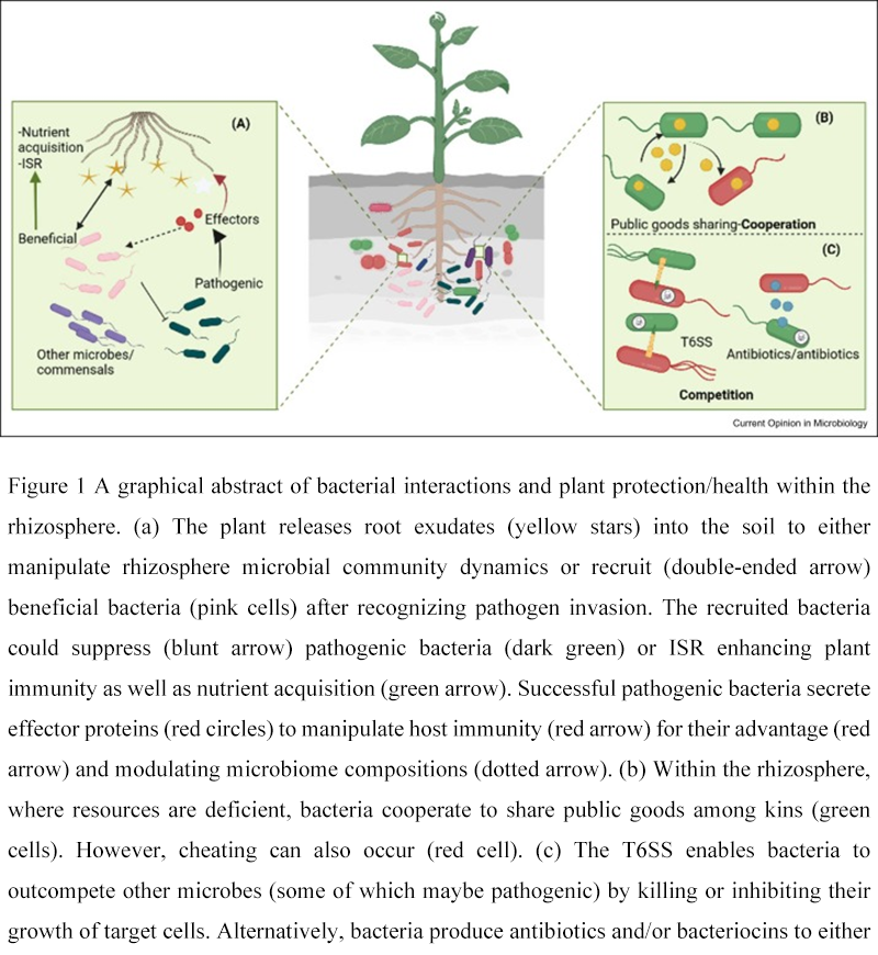 Figure 1 A graphical abstract of bacterial interactions and plant protection/health within the rhizosphere. (a) The plant releases root exudates (yellow stars) into the soil to either manipulate rhizosphere microbial community dynamics or recruit (double-ended arrow) beneficial bacteria (pink cells) after recognizing pathogen invasion. The recruited bacteria could suppress (blunt arrow) pathogenic bacteria (dark green) or ISR enhancing plant immunity as well as nutrient acquisition (green arrow). Successful pathogenic bacteria secrete effector proteins (red circles) to manipulate host immunity (red arrow) for their advantage (red arrow) and modulating microbiome compositions (dotted arrow). (b) Within the rhizosphere, where resources are deficient, bacteria cooperate to share public goods among kins (green cells). However, cheating can also occur (red cell). (c) The T6SS enables bacteria to outcompete other microbes (some of which maybe pathogenic) by killing or inhibiting their growth of target cells. Alternatively, bacteria produce antibiotics and/or bacteriocins to either kill or inhibit competing microbes (Adopted from Chepsergon and Moleleki, 2023) |