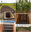 Figure 2 Custom designed root window construction at the experimental field site of the DFG priority program 2089 “Rhizosphere Spatiotemporal Organisation-A Key to Rhizosphere Functions”. (a) Experimental plot (loam) with newly installed root window construction and observation pit at the short end of the plot. (b) Close-up of the root window construction, with observation window being covered by two removable PVC boards that are pressed against the soil plot with aluminium bars and wing bolts for stability and protection against light. (c) Root window observation area (60 × 60 cm) of a loam plot planted with Zea mays L. wild-type (B73) at growth stage BBCH 59. (d) Root window pits covered by wooden boards in between sampling campaigns (Adopted from Bilyera et al., 2021) |