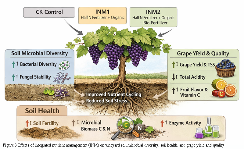 ![]() Figure 3 Effects of integrated nutrient management (INM) on vineyard soil microbial diversity, soil health, and grape yield and quality |